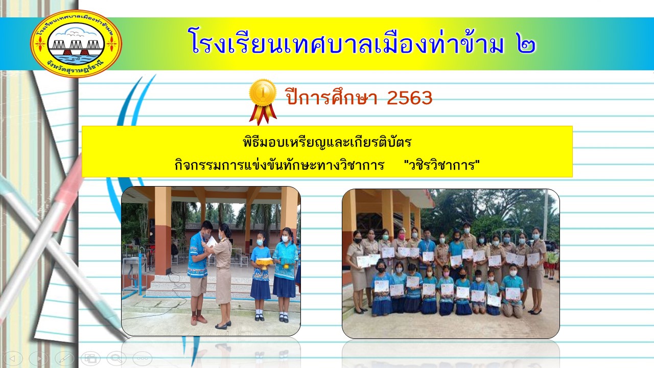 29 ธ.ค. 63 รองเสาวณีย์ รักษ์ทองมอบเกียรติบัตรและเหรียญรางวัลให้กับนักเรียนและคณะครูผู้ฝึกซ้อมกิจกรรมการแข่งขันทักษะทางวิชาการ