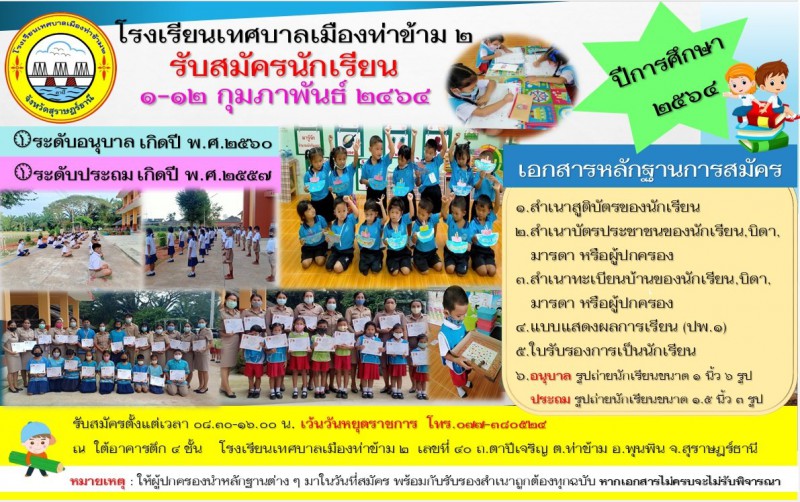 5 ก.พ. 64 โรงเรียนเทศบาลเมืองท่าข้าม ๒ รับสมัครนักเรียนระดับชั้นอนุบาล และระดับชั้นประถมศึกษาปีที่ 1 ปีการศึกษา 2564