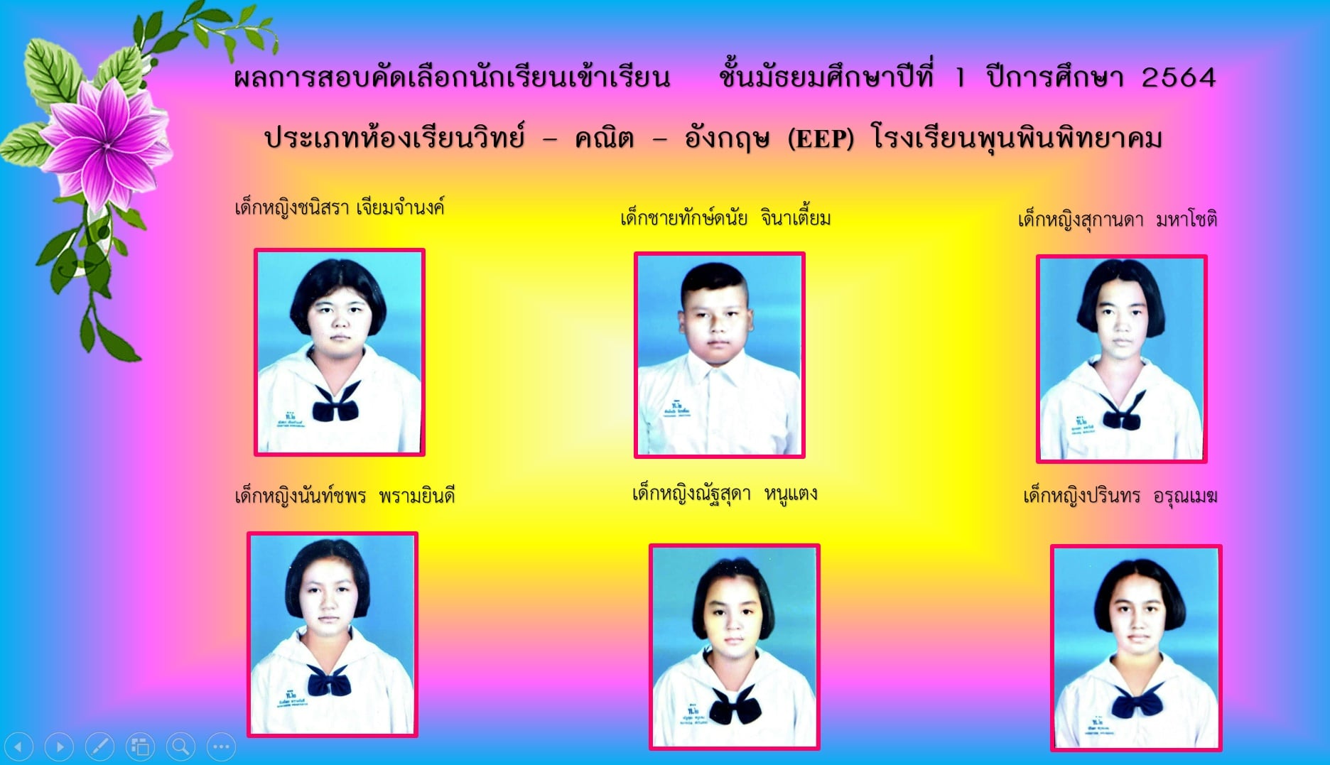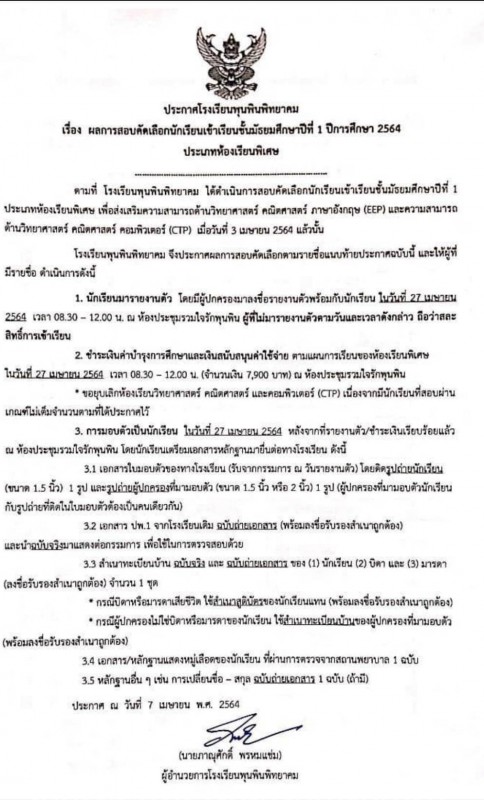 9 เม.ย. 64 ผลการสอบคัดเลือกนักเรียนเข้าเรียนชั้นมัธยมศึกษาปีที่๑ ประเภทห้องเรียนพิเศษ โรงเรียนพุนพินพิทยาคม