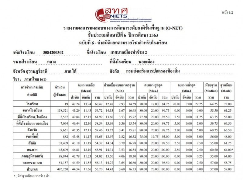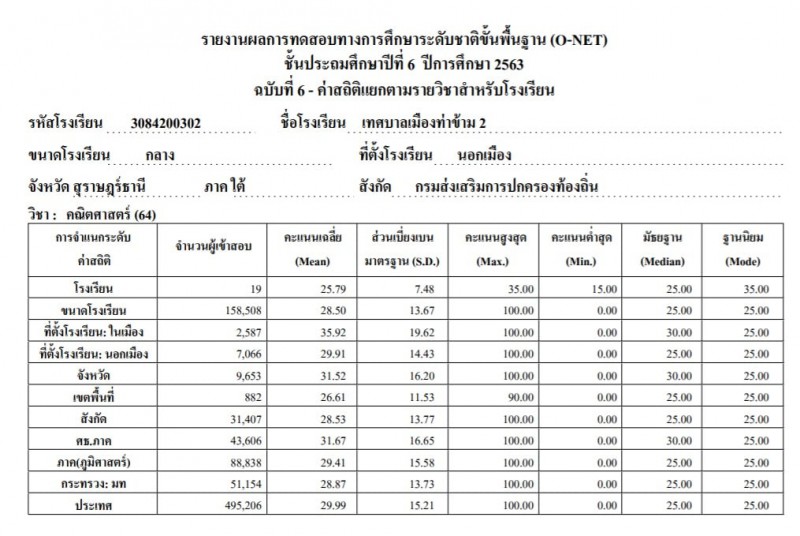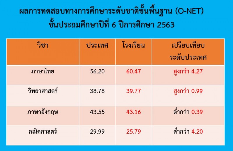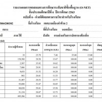 22 เม.ย. 64 ผลการทดสอบทางการศึกษาระดับชาติขั้นพื้นฐาน (O-NET) ชั้นประถมศึกษาปีที่ 6 ปีการศึกษา 2563