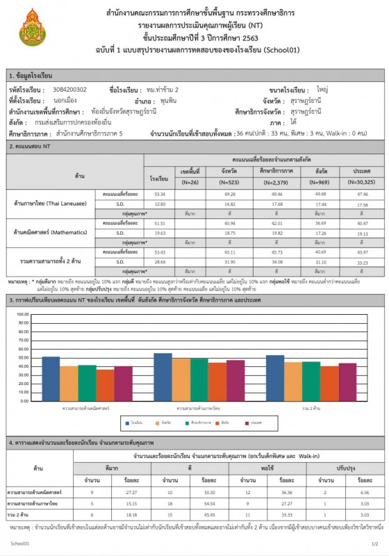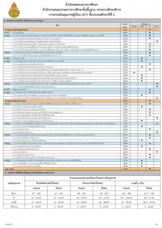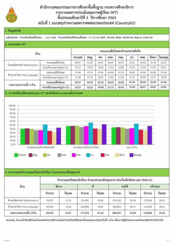 6 พ.ค. 64 รายงานผลการประเมินคุณภาพผู้เรียน (NT) ชั้นประถมศึกษาปีที่ 3 ปีการศึกษา 2563