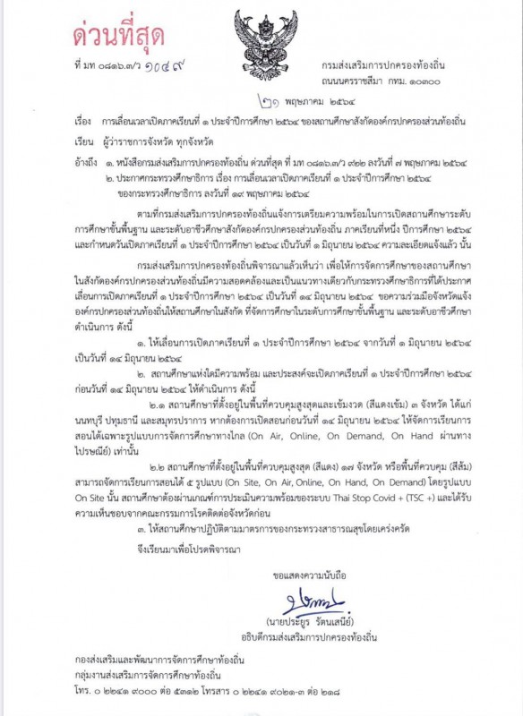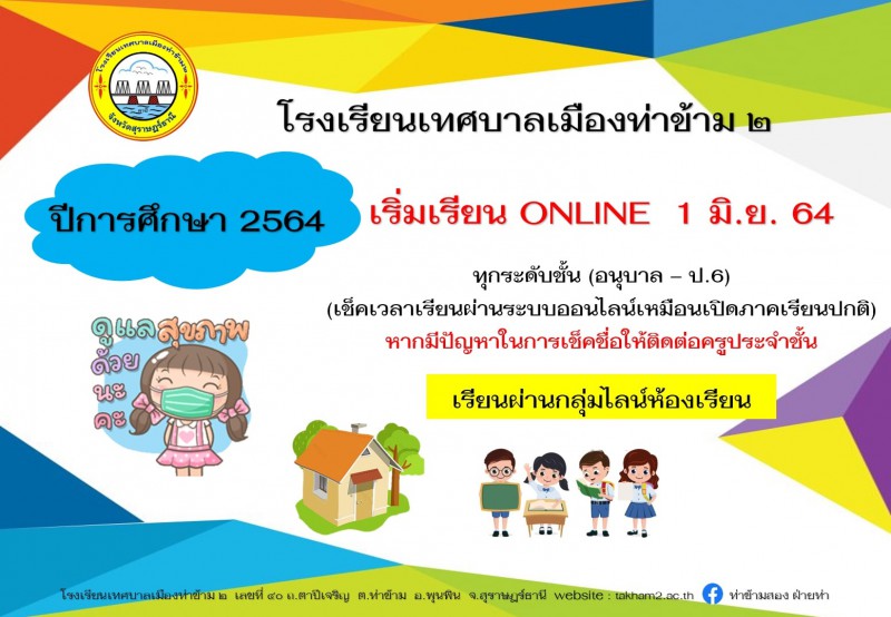 22 พ.ค. 64 โรงเรียนจะเริ่มเรียน Online วันที่ 1 มิ.ย. 64 ตั้งแต่ระดับชั้นอนุบาล-ป.6 และเช็คเวลาเรียนผ่านระบบออนไลน์