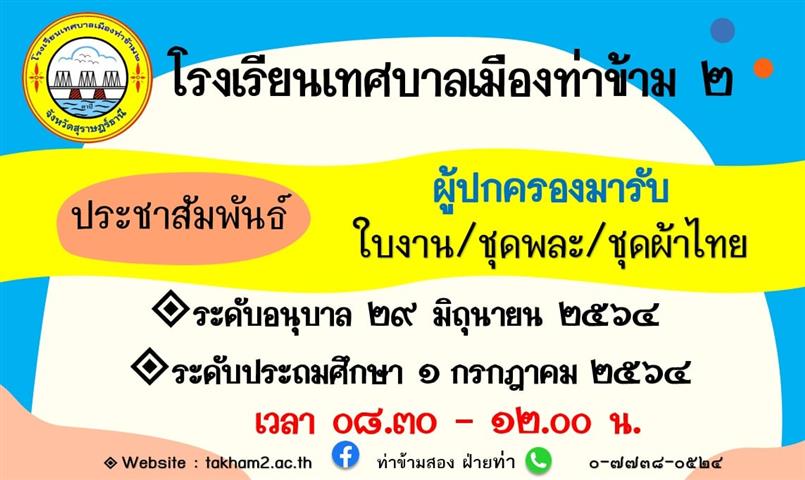 ประชาสัมพันธ์ ถึงผู้ปกครองนักเรียนโรงเรียนเทศบาลเมืองท่าข้าม ๒ ให้มารับใบงาน/ชุดพละ/ชุดผ้าไทย ตามกำหนดวันและเวลาดังกล่าวด้วย ณ อาคารใหม่ตึก 4 ชั้น โรงเรียนเทศบาลเมืองท่าข้าม ๒                        		 |