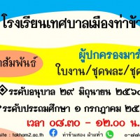 25 มิ.ย. 64 ประชาสัมพันธ์ ถึงผู้ปกครองนักเรียนโรงเรียนเทศบาลเมืองท่าข้าม ๒ ให้มารับใบงานชุดพละชุดผ้าไทย