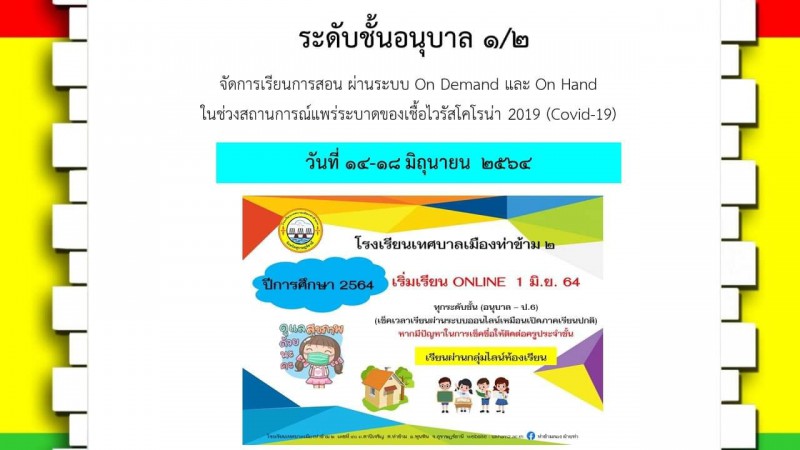 จัดการเรียนการสอน ผ่านระบบ On Demand และ On Hand ในช่วงสถานการณ์แพร่ระบาดของเชื้อไวรัสโคโรน่า 2019 (Covid-19) วันที่ 14-18 มิถุนายน 2564 อ.1/2
