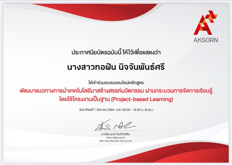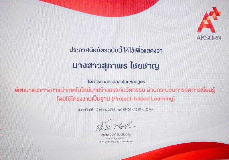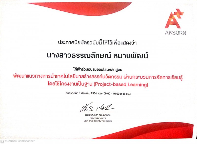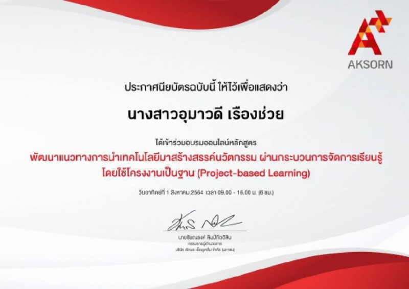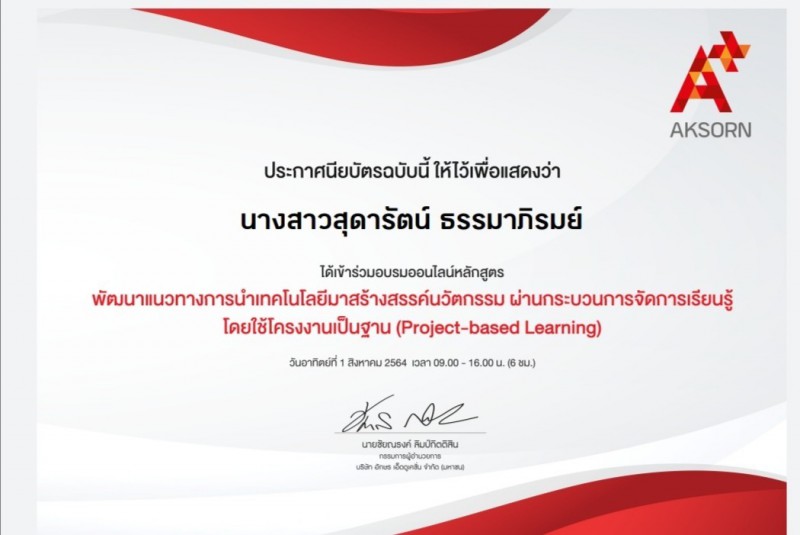หัวข้อการอบรม : พัฒนาแนวทางการนำเทคโนโลยีมาสร้างสรรค์นวัตกรรม ผ่านกระบวนการจัดการเรียนรู้ โดยใช้โครงงานเป็นฐาน( Project-base Learning )