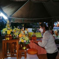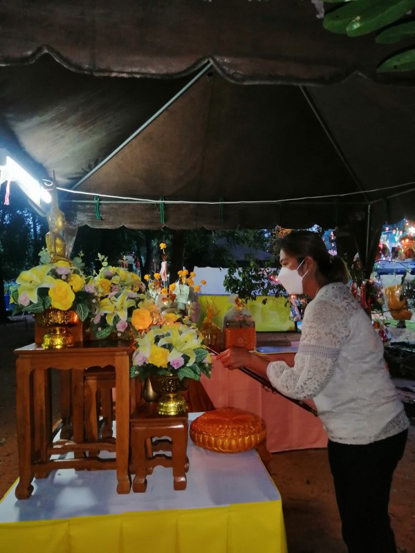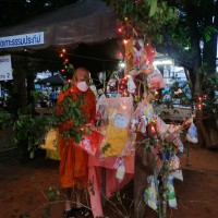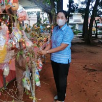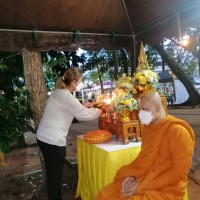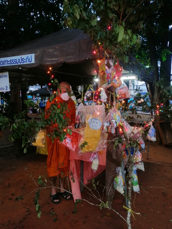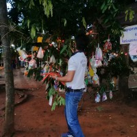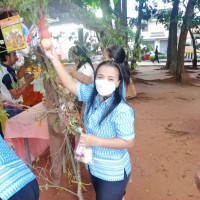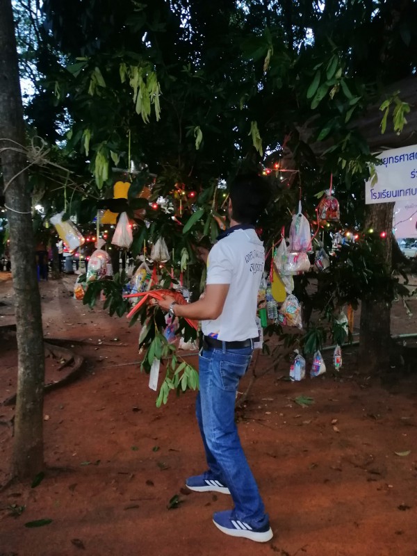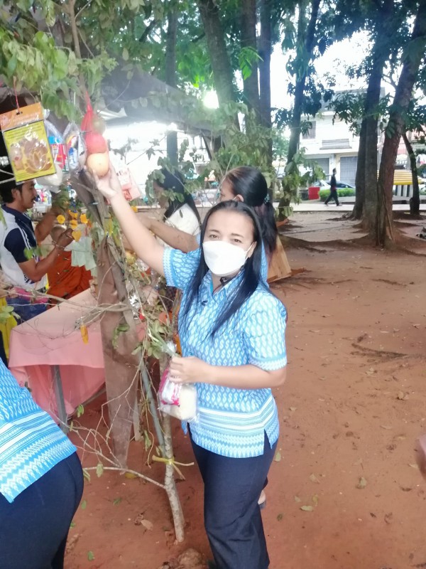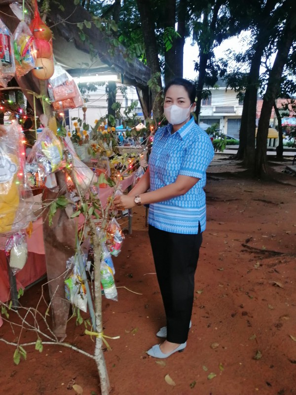 นางธนัชพร โอวรารินท์ ผู้อำนวยการสถานศึกษาโรงเรียนเทศบาลเมืองท่าข้าม ๒ พร้อมคณะครูและบุคลากรร่วมชักพุ่มผ้าป่า เนื่องในวันออกพรรษา ณ สวนสาธารณะ