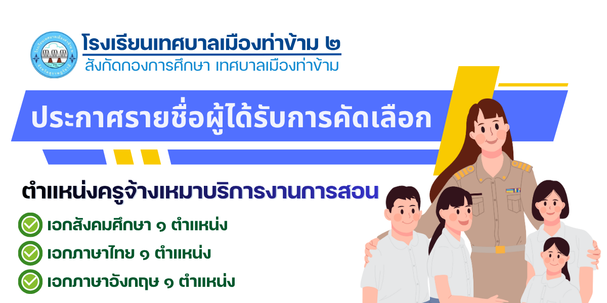 ประชาสัมพันธ์โรงเรียนเทศบาลเมืองท่าข้าม ๒ ประกาศรายชื่อนักเรียนผู้มีสิทธิ์เข้าศึกษาในระดับชั้นอนุบาลปีที่ ๒ - ๓ และระดับชั้นประถมศึกษาปีที่ ๒ ประจำปีการศึกษา ๒๕๖๗