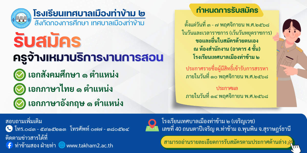 ประชาสัมพันธ์ เปิดรับสมัครครูจ้างเหมาบริการงานการสอน จำนวน 3 ตำแหน่ง