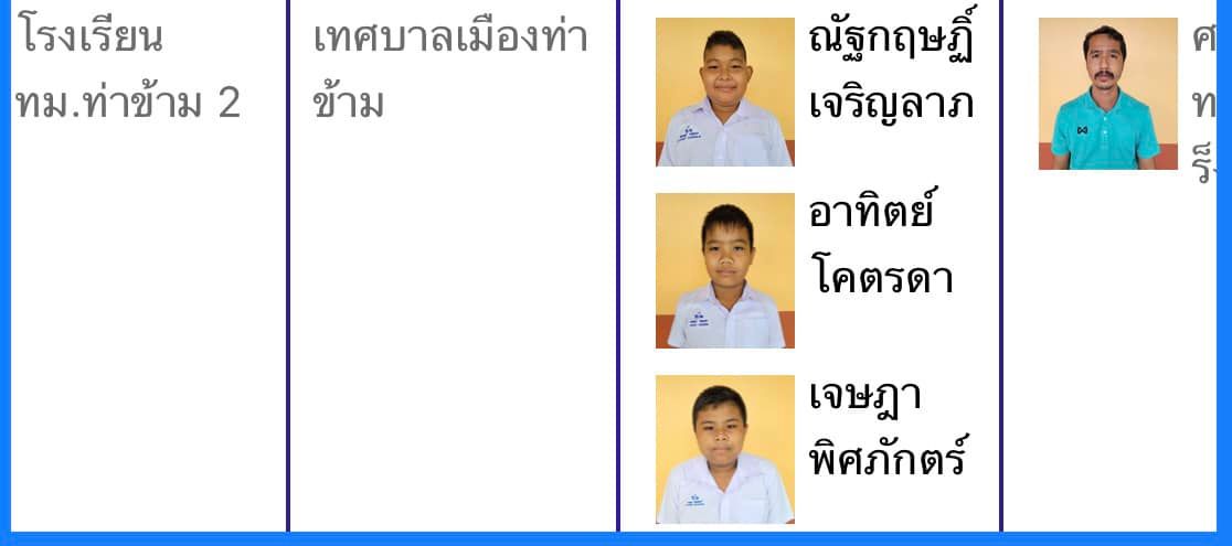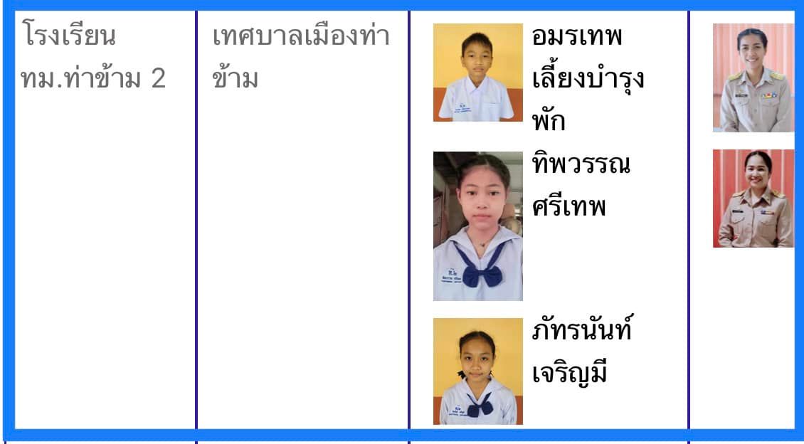ผลการแข่งขันตัวแทนจากโรงเรียนเทศบาลเมืองท่าข้าม ๒ (ฝ่ายท่า) เทศบาลเมืองท่าข้าม ต.ท่าข้าม อ.พุนพิน จ.สุราษฎร์ธานี