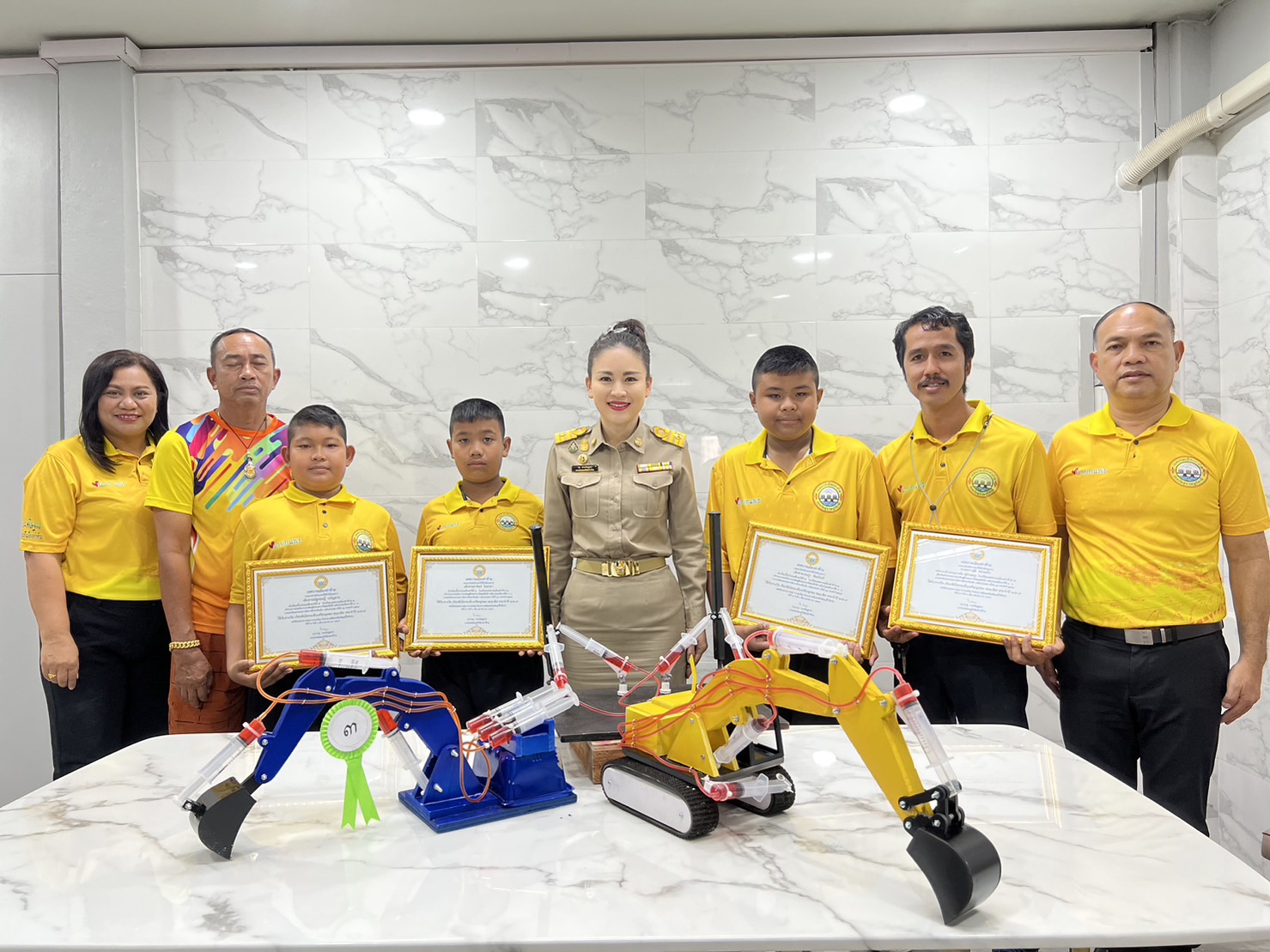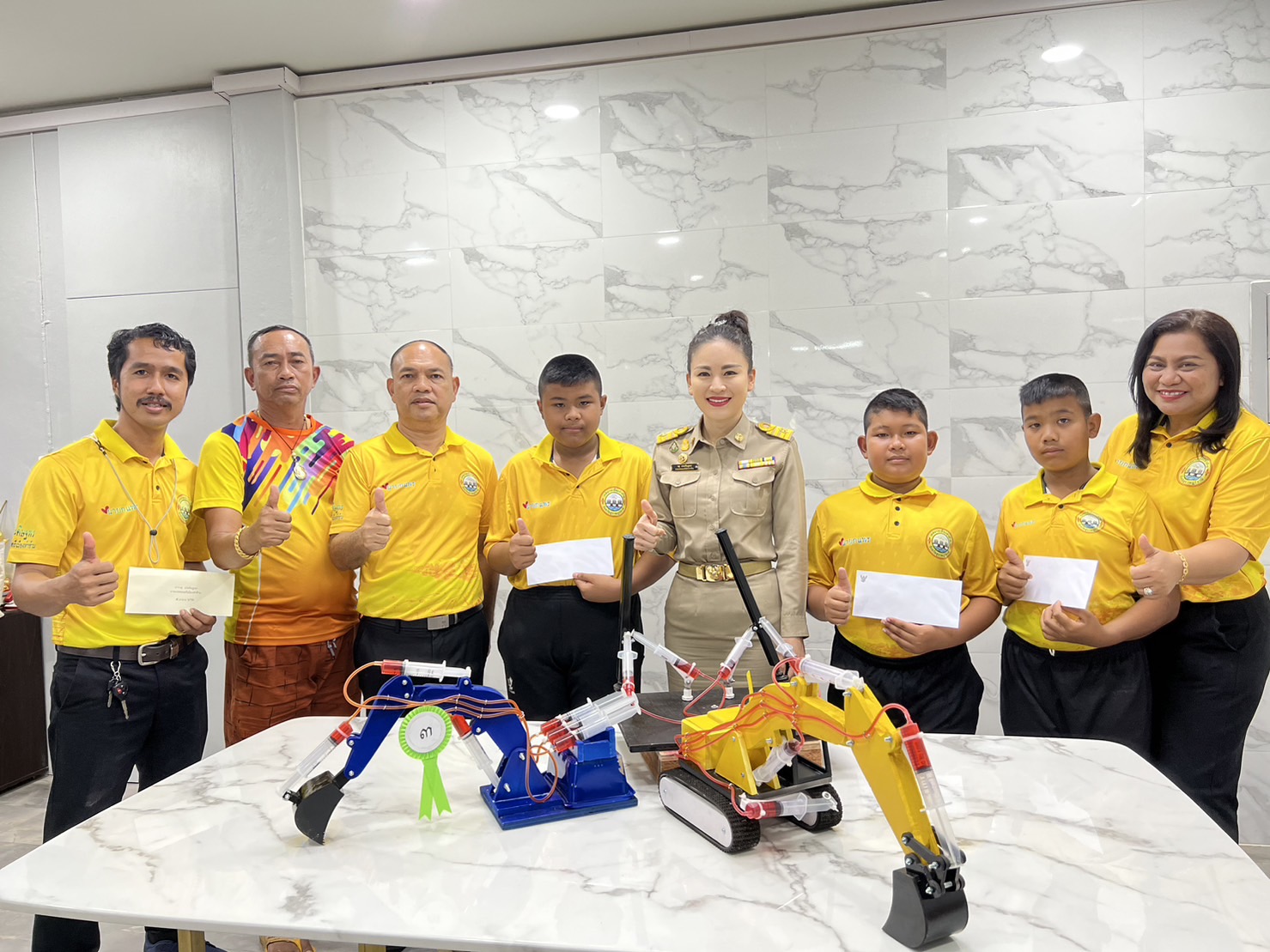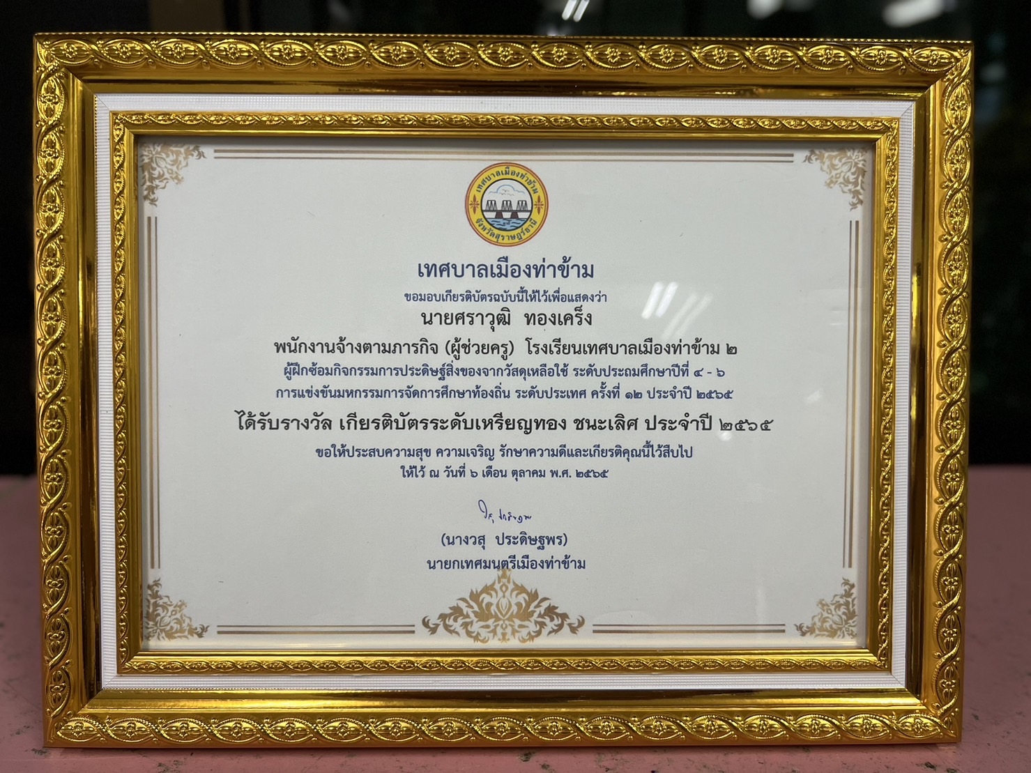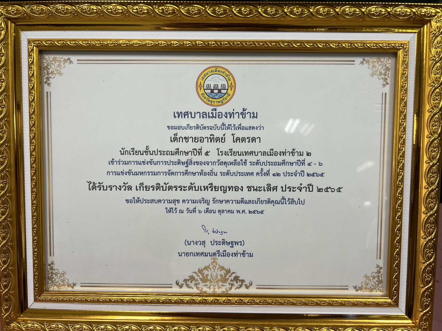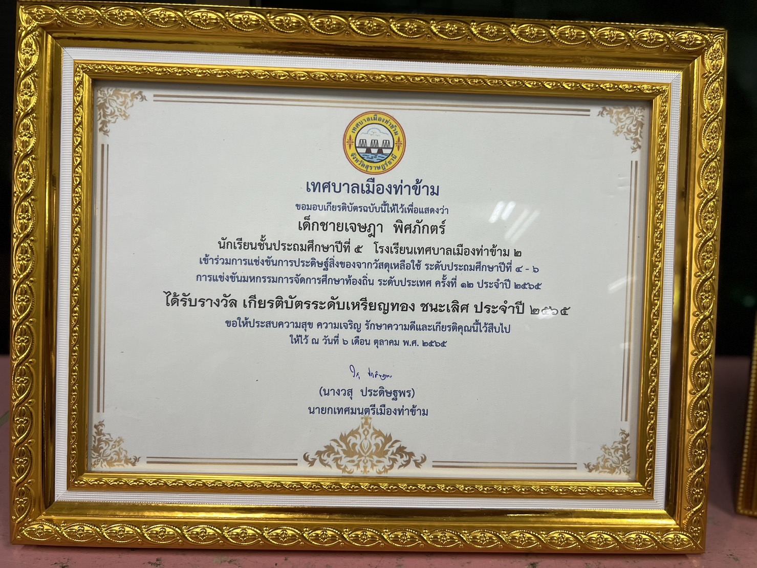 นายกเทศมนตรี นางวสุ ประดิษฐพร นายกเทศมนตรีเมืองท่าข้าม ให้กำลังใจ ผู้บริหารโรงเรียนเทศบาลเมืองท่าข้าม ๒ ครูผู้ฝึกซ้อมและนักเรียนชนะเลิศเหรียญทองอันดับ 1 การแข่งขันประดิษฐ์เศษวัสดุด ป.4-6