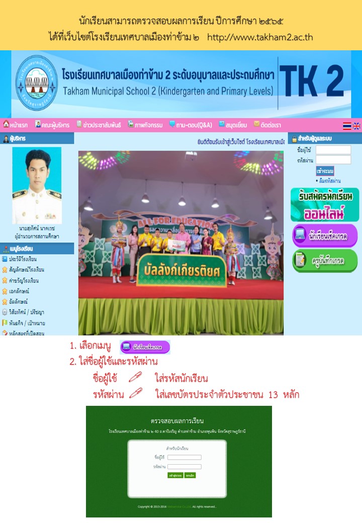 นักเรียนสามารถตรวจสอบผลการเรียน ปีการศึกษา ๒๕๖๕ ได้ที่ เว็บไซต์โรงเรียนเทศบาลเมืองท่าข้าม ๒ http://www.takham2.ac.th/
