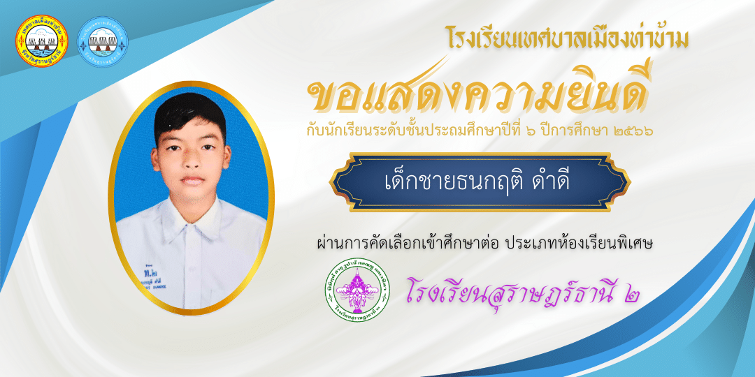 ขอแสดงความยินดีกับเด็กชายธนกฤติ ดำดี นักเรียนระดับชั้นประถมศึกษาปีที่ ๖ โรงเรียนเทศบาลเมืองท่าข้าม ๒ ที่ผ่านการคัดเลือกเข้าศึกษาต่อในระดับชั้นมัธยมศึกษาปีที่ ๑ โรงเรียนสุราษฎร์ธานี ๒ ประเภทห้องเรียนพิเศษ