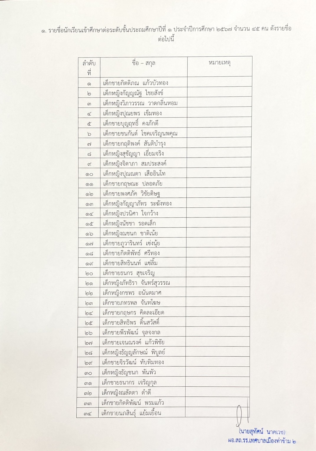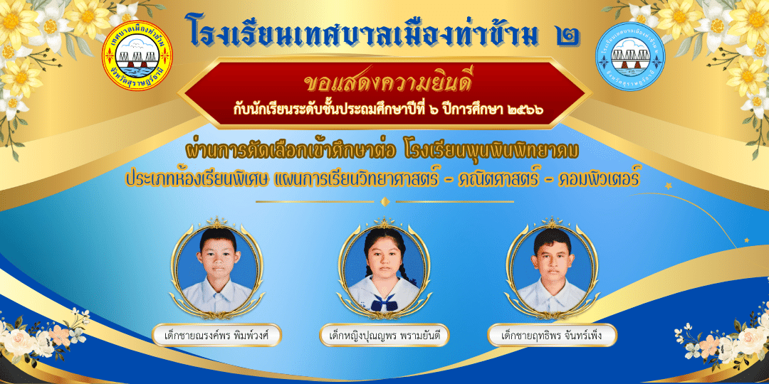 ขอแสดงความยินดีกับนักเรียน ระดับชั้นประถมศึกษาปีที่ ๖ โรงเรียนเทศบาลเมืองท่าข้าม ๒ ที่ผ่านการคัดเลือกเข้าศึกษาต่อระดับชั้นมัธยมศึกษาปีที่ ๑ โรงเรียนพุนพินพิทยาคม