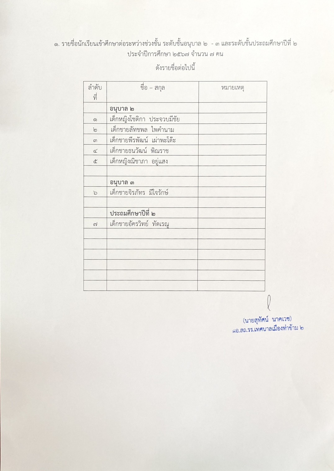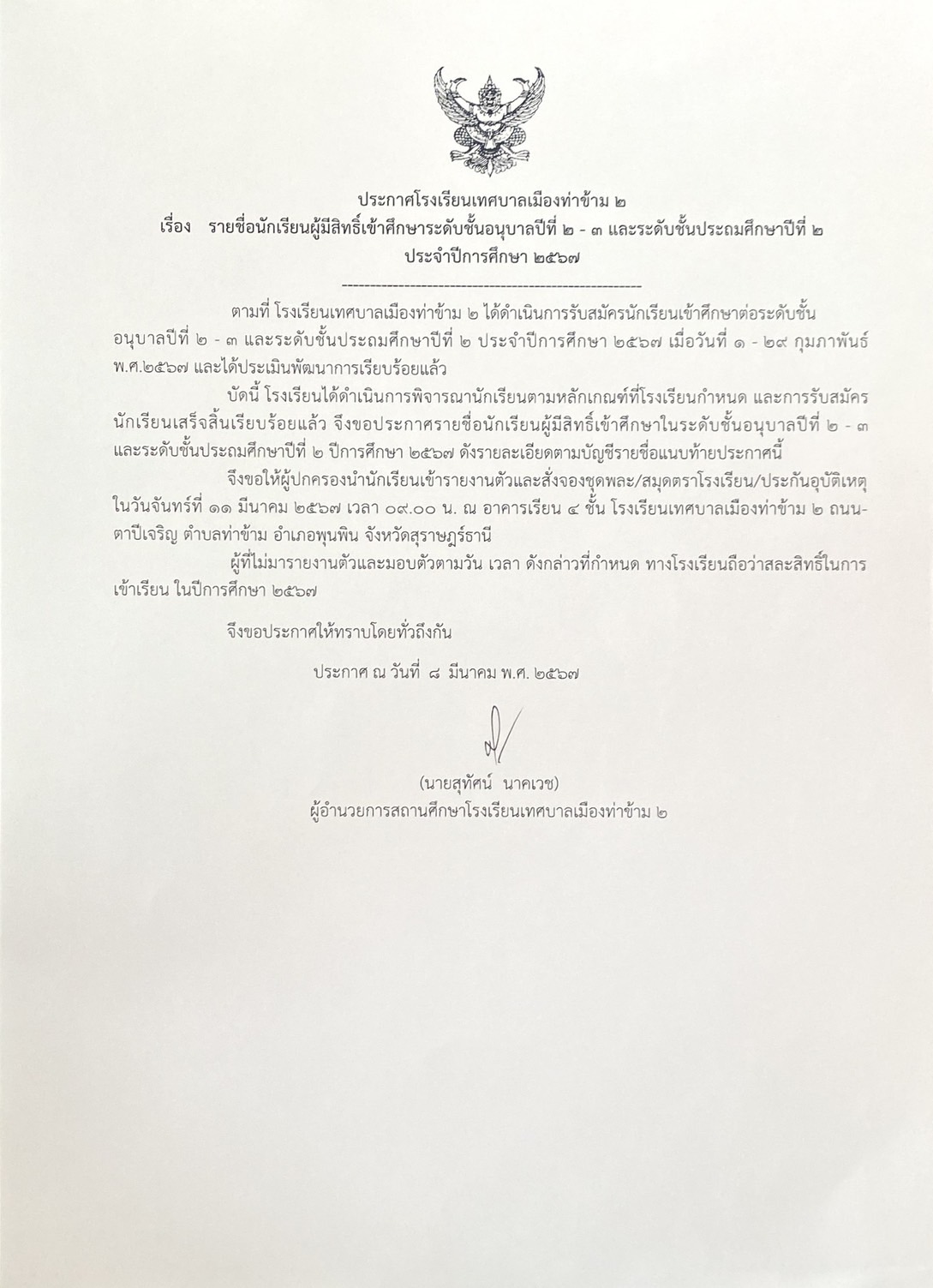 ประชาสัมพันธ์โรงเรียนเทศบาลเมืองท่าข้าม ๒ ประกาศรายชื่อนักเรียนผู้มีสิทธิ์เข้าศึกษาในระดับชั้นอนุบาลปีที่ ๒ - ๓ และระดับชั้นประถมศึกษาปีที่ ๒ ประจำปีการศึกษา ๒๕๖๗
