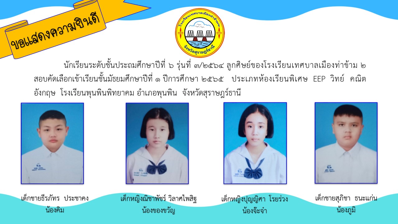 | ผู้บริหาร คณะครู โรงเรียนเทศบาลเมืองท่าข้าม ๒ ขอแสดงความยินดีกับนักเรียนชั้นประถมศึกษาปีที่ ๖ รุ่นที่ ๓/๒๕๖๔ สอบคัดเลือกเข้าเรียนชั้นมัธยมศึกษาปีที่ ๑ ปีการศึกษา ๒๕๖๕ ประเภทห้องเรียนพิเศษ EEP วิทย์ คณิต อังกฤษ โรงเรียนพุนพินพิทยาคม อำเภอพุนพิน จังหวัดสุราษฎร์ธานี จำนวน ๔ คน |