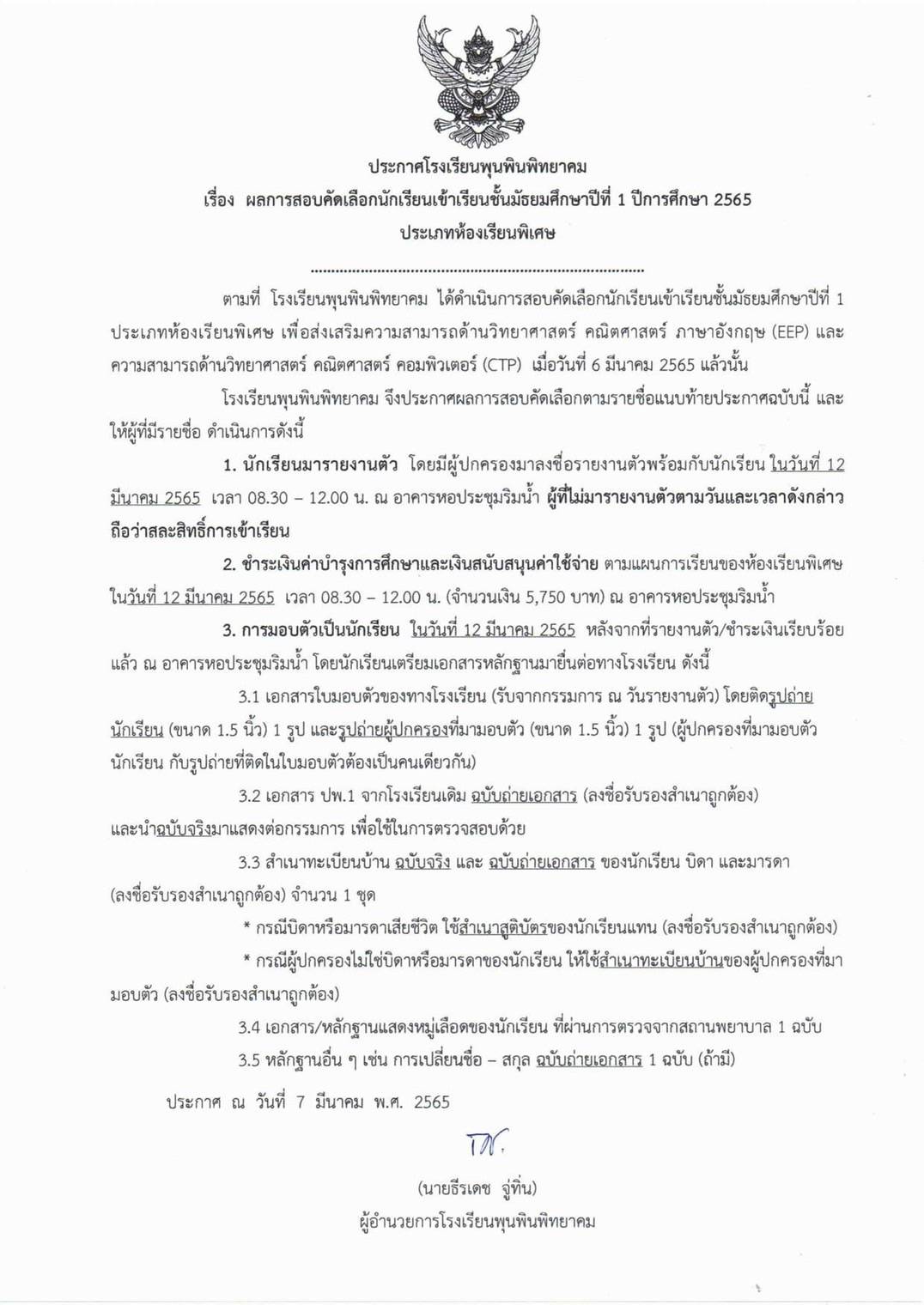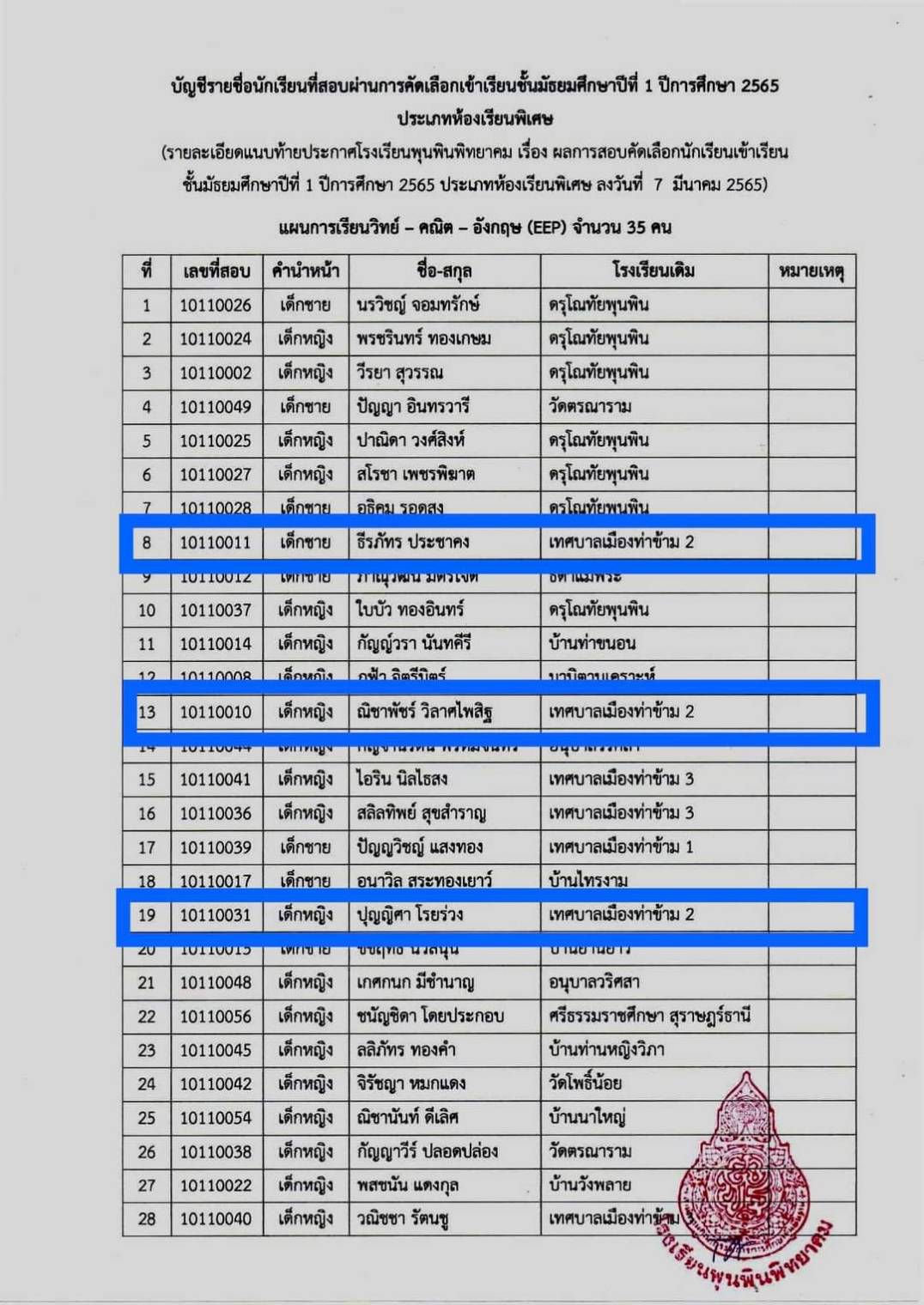 ขอแสดงความยินดีกับนักเรียนชั้นประถมศึกษาปีที่ ๖ รุ่นที่ ๓/๒๕๖๔ สอบคัดเลือกเข้าเรียนชั้นมัธยมศึกษาปีที่ ๑ ปีการศึกษา ๒๕๖๕ ประเภทห้องเรียนพิเศษ EEP วิทย์ คณิต อังกฤษ โรงเรียนพุนพินพิทยาคม อำเภอพุนพิน จังหวัดสุราษฎร์ธานี