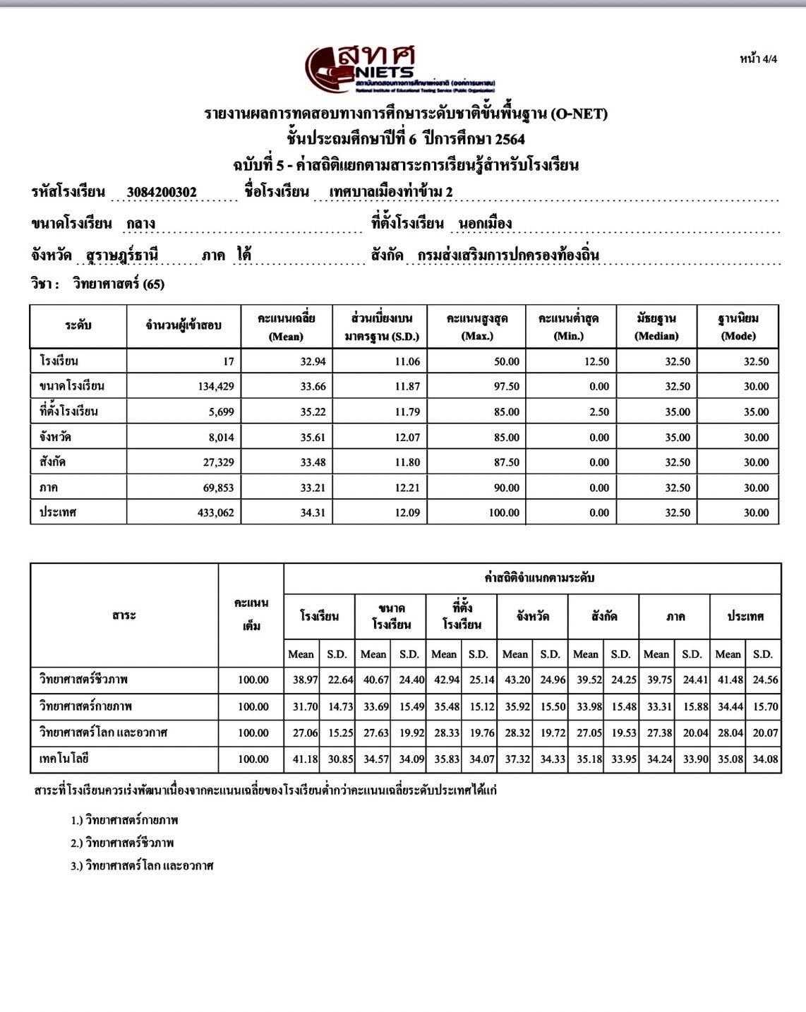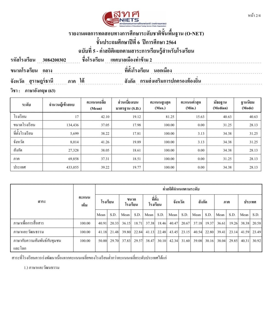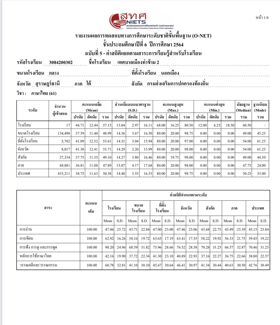 ผลการสอบโอเน็ต O-NET ป.6 ปีการศึกษา 2564 มีผลการสอบในวิชาภาษาไทยและภาษาต่างประเทศ(ภาษาอังกฤษ) สูงกว่าระดับประเทศ