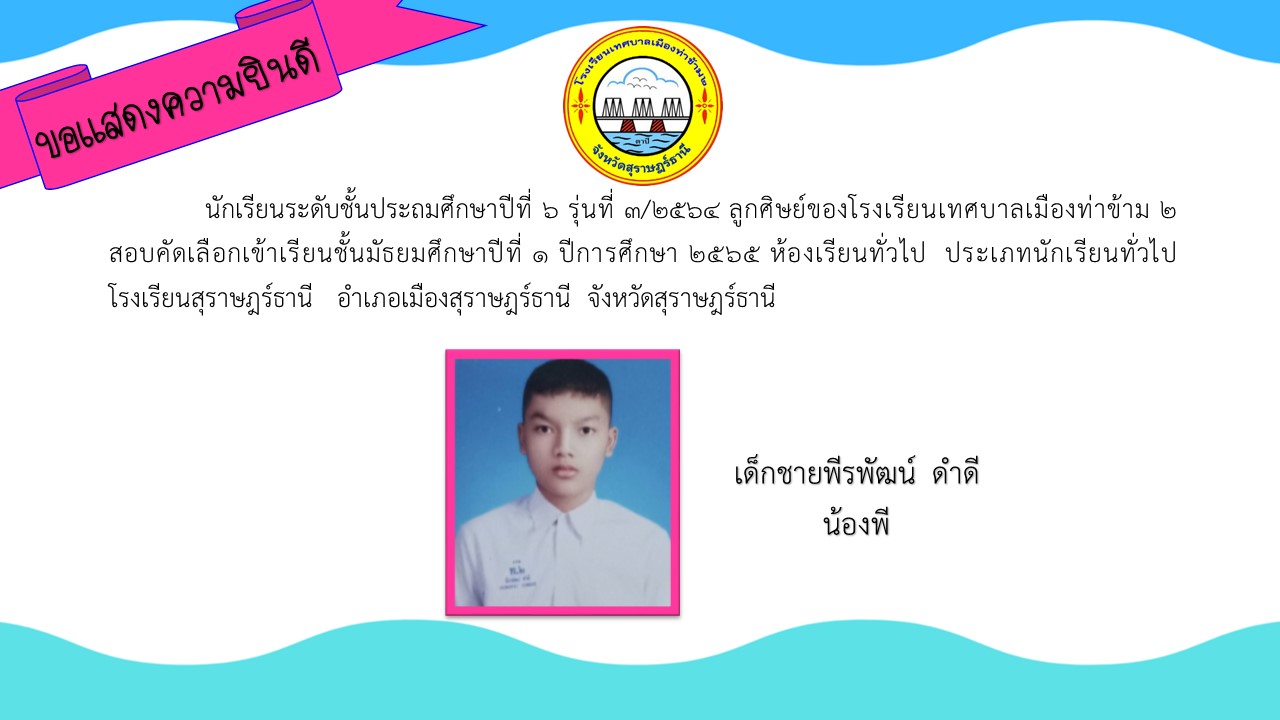 | ผู้บริหาร คณะครู โรงเรียนเทศบาลเมืองท่าข้าม ๒ ขอแสดงความยินดีกับนักเรียนชั้นประถมศึกษาปีที่ ๖ รุ่นที่ ๓/๒๕๖๔ สอบคัดเลือกเข้าเรียนชั้นมัธยมศึกษาปีที่ ๑ ปีการศึกษา ๒๕๖๕ โรงเรียนสุราษฎร์ธานี อำเภอเมืองสุราษฎร์ธานี จังหวัดสุราษฎร์ธานี จำนวน ๑ คน เด็กชายพีรพัฒน์ ดำดี (น้องพี) |