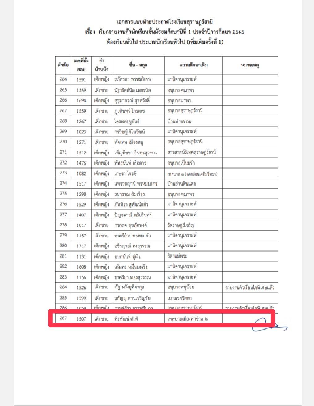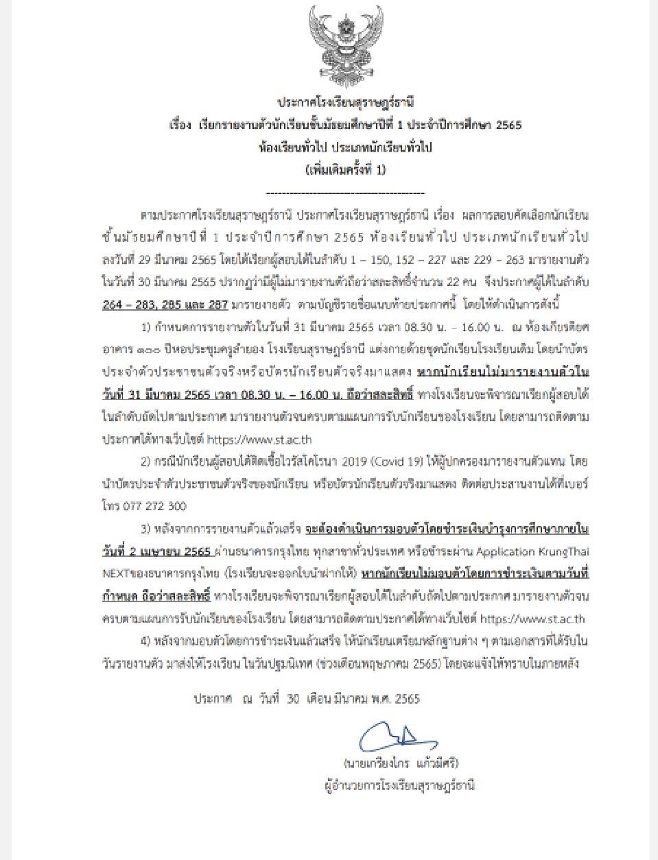 ขอแสดงความยินดีกับนักเรียนชั้นประถมศึกษาปีที่ ๖ รุ่นที่ ๓/๒๕๖๔ สอบคัดเลือกเข้าเรียนชั้นมัธยมศึกษาปีที่ ๑ ปีการศึกษา ๒๕๖๕ โรงเรียนสุราษฎร์ธานี อำเภอเมืองสุราษฎร์ธานี จังหวัดสุราษฎร์ธานี จำนวน ๑ คน เด็กชายพีรพัฒน์ ดำดี (น้องพี)