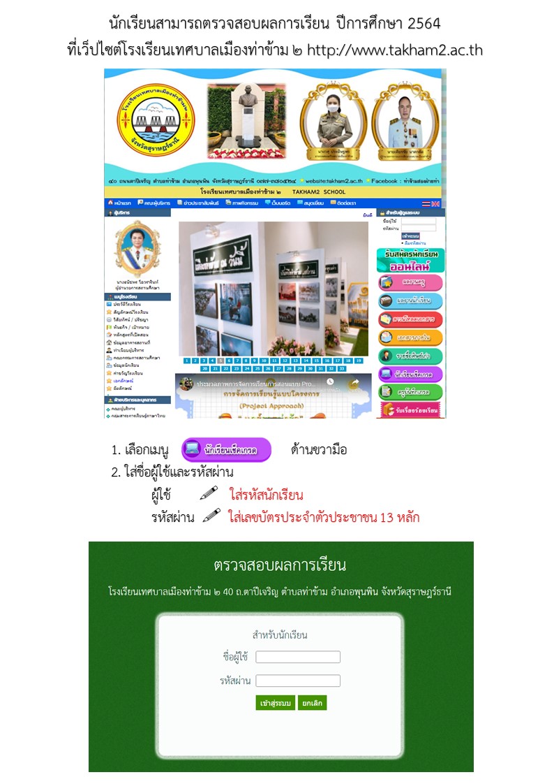 แจ้งประกาศผลการเรียน ประจำปีการศึกษา 2564 นักเรียนสามารถเข้าไปดูผลการเรียนได้ หน้าเว็บไซต์โรงเรียนเทศบาลเมืองท่าข้าม ๒ http://www.takham2.ac.th ตั้งแต่วันที่ 4 เมษายน 2565 เป็นต้นไป |